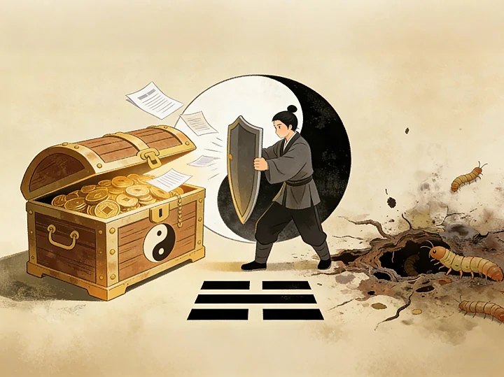 不得不說,大畜卦確實藏著「值得深耕」的寓意,朋友認為這份工作有可挖掘的價值,這一看法並非不對;但是我們得區分「個人的技術成長」與「合作關係的品質」。就技術層面而言,朋友能學到東西,提升能力,這屬於個人的寶貴收穫;然而就合作關係的品質來說,那就要歸結到變卦「蠱」的警示了。蠱卦的意象是器皿生蟲,象徵問題源自內部的腐敗與紊亂。兩年前朋友一股腦地投入這項工作,立刻啟動大畜卦初九,初九爻辭說:「有厲,利已。」意即前方有危險(有厲),最有利的做法是「停止不前」(利已),切勿強行推進。朋友沒有停止不前,於是啟動初九爻,卦象順勢轉變為蠱卦,最終陷入一團混亂的腐敗局面。幸好現在知道要適可而止。事實上,一份工作或合作的選擇,不能只看內容是否有價值,合作方內部的人事風氣、團隊氛圍,同樣是我們就職或締結合作前,必須慎重考量的關鍵因素。
